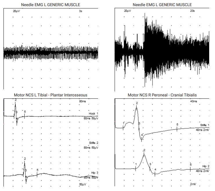 This led to referral to Thomas Mignan – specialist neurologist at Dovecote Veterinary Hospital. Thomas found the pelvic limb withdrawal reflexes decreased and absent patellar reflexes, therefore confirming our suspicion of a neuro-muscular condition. Electrophysiological testing revealed myotonic discharges and complex repetitive discharges in several muscles throughout both the pelvic and the thoracic limbs. Motor nerve conduction studies revealed markedly reduced compound muscle action potentials of the sciatic nerve but also ulnar nerve, altogether suggesting a peripheral neuropathy. Nicolas Granger was then invited to help with performing peripheral nerve biopsies. Muscle biopsies were consistent with denervation atrophy and the peroneal nerve biopsy (analysed through a collaboration with the Royal Veterinary College) revealed marked axonal loss and degeneration, with numerous axonal sprouts attempting but failing to regenerate and resulting in an axonal neuropathy.