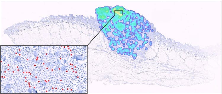 Model results with heatmap overlay highlights regions with the highest Ki-67 positivity (warmest colours). Inset: A high-power view of model results displaying Ki-67 nuclear positivity in red.