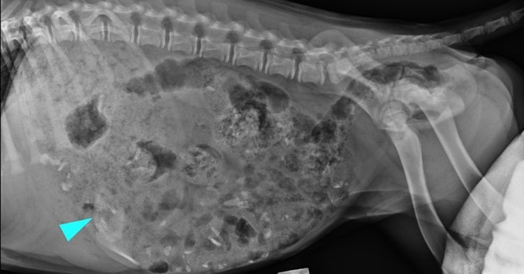 When he arrived at BVS, Marlo underwent a series of investigations. An ultrasound revealed his stomach was markedly distended and filled with a large amount of kibble. A lateral abdominal radiograph confirmed the foreign body – later measured at a sizeable 6.5cm by 3.5cm – was still inside the stomach.